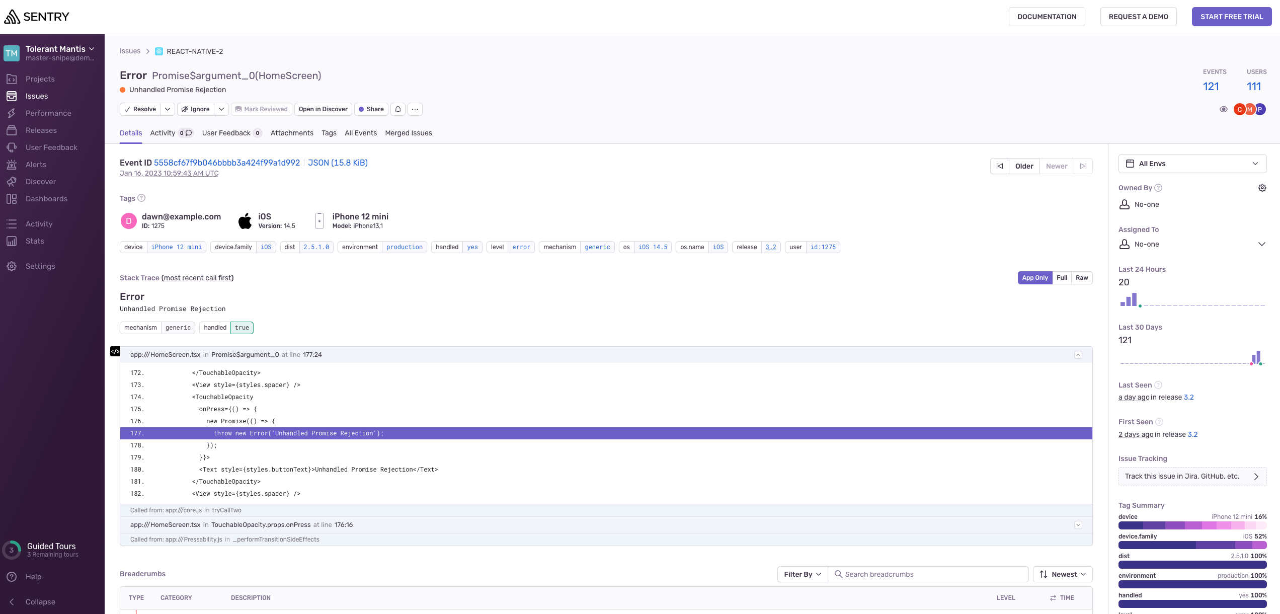 - Breadcrumbs 섹션에서 해당 오류가 발생된 시점 이전의 동작 히스토리를 확인 할 수 있습니다.