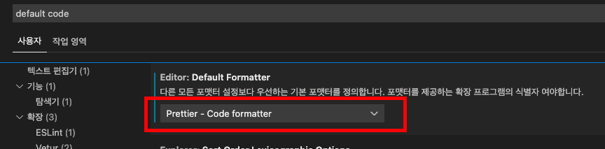 - 기본설정 > 설정 > 텍스트 편집기로 이동, Default Formatter 를 Prettier - Code formatter로 변경.)