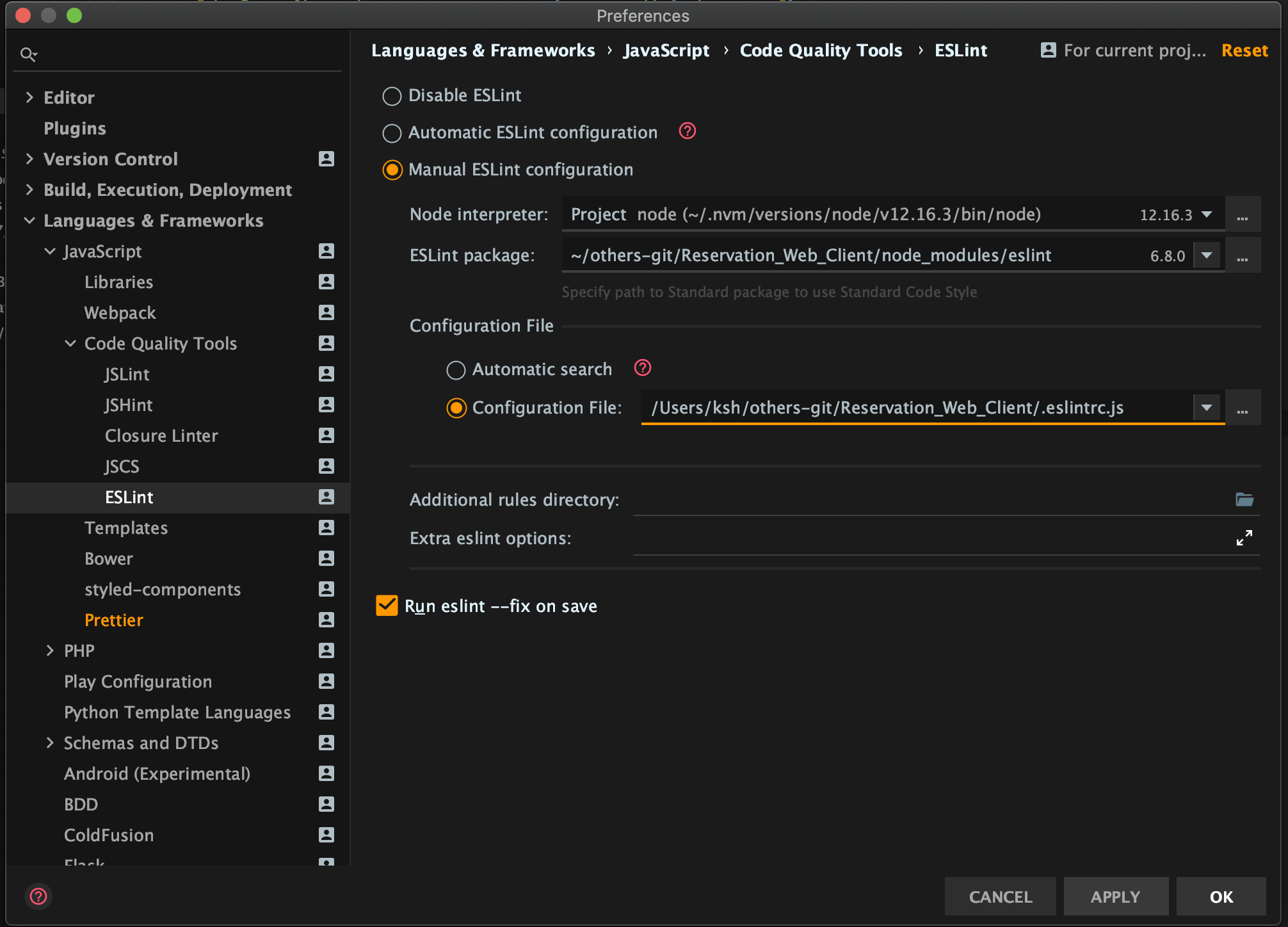 - Configuration File : 보통은 Automatic search를 체크.만약 정상 작동 안할 경우 Configuration File에서 프로젝트 루트 디렉토리/.eslint.js 선택