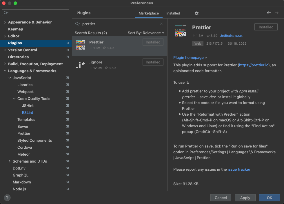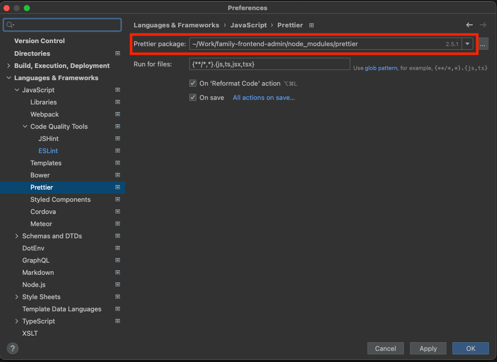 - Preferences > Languages & Frameworks > JavaScript > Prettier > Prettier package 경로 지정, On save 항목 체크 ( Save on Actions )